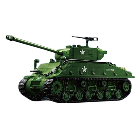 The M4 Sherman set recreates the iconic American medium tank of World War II. Over 1600 pieces build a detailed model with the characteristic hull shape and turret that made the Sherman the backbone of Allied armored forces.